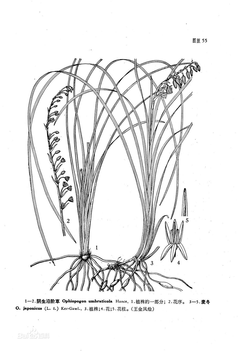 百合科多年生草本,成叢生長,高30厘米左右。葉叢生,細長,深綠色,形如韭菜?;ㄇo自葉叢中生出,花小,淡紫色,形成總狀花序。果為漿果,圓球形,成熟后為深綠色或黑藍色。根莖短,有多數(shù)須根,在部分須根的中部或尖端常膨大成紡錘形的肉質(zhì)塊根,即藥用的麥冬。